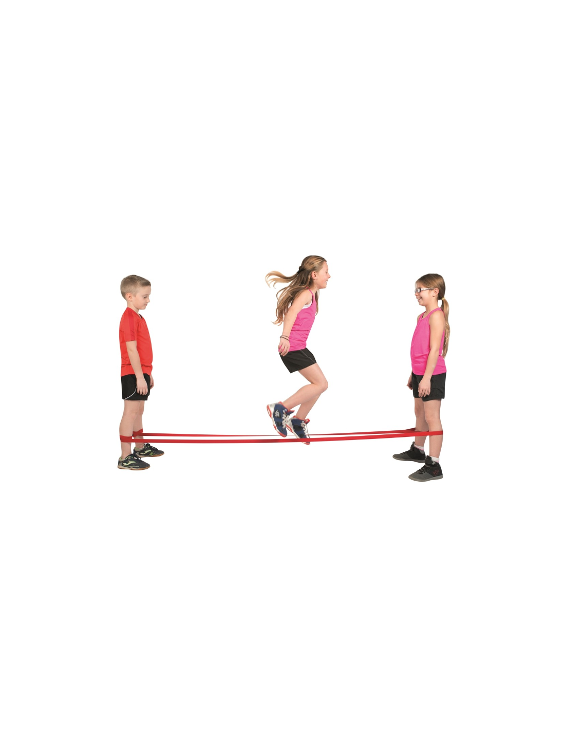 Estas bandas elásticas para saltar se pueden unir fácilmente a los tobillos y ayudan a desarrollar el equilibrio, la agilidad y la coordinación. Las coloridas bandas elásticas de 2,5 cm de ancho miden 240 cm. Color rojo.