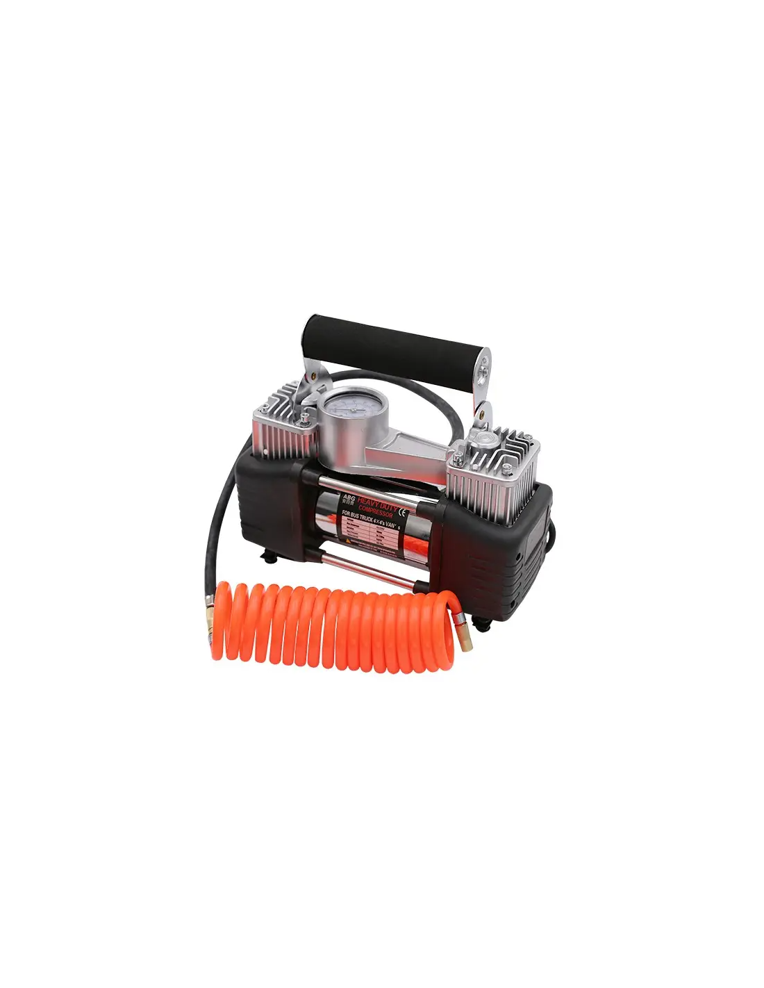 Compresor de dos cilindros. presión máxima de arranque: 200psi, presión media de trabajo: 150psi. 3 diferentes tipos de aguja. incluye maletín para guardarlo.