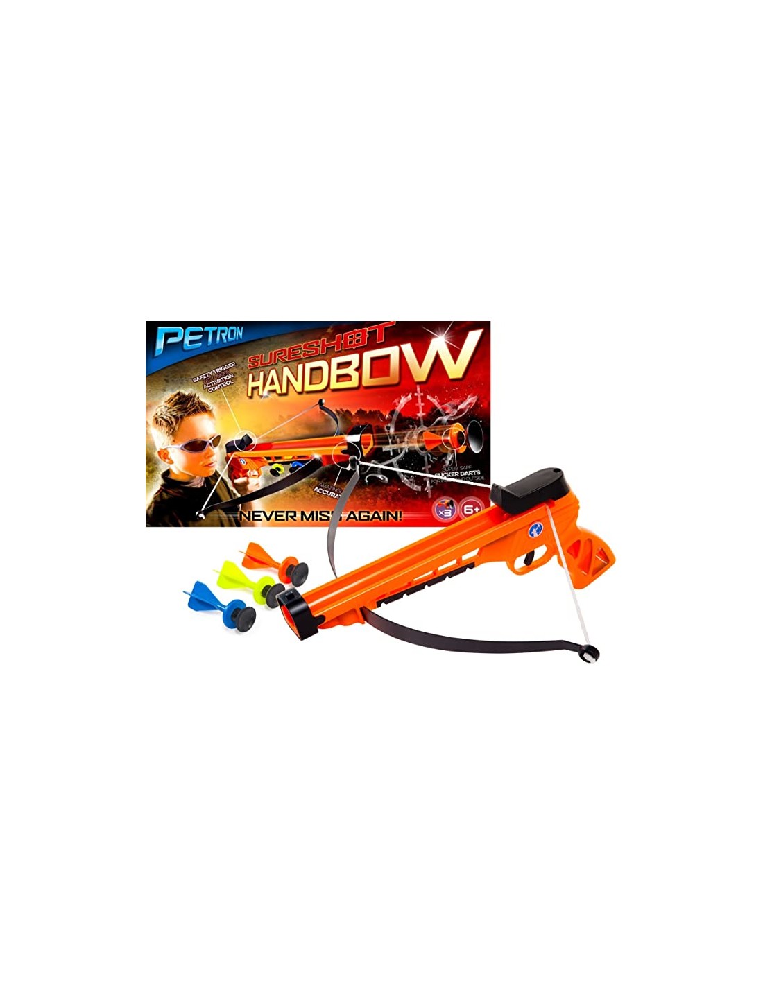 Se ve y se siente como un Handbow real, pero dispara dardos de succión súper seguros. Ideal para los tiradores más jóvenes. El gatillo de seguridad garantiza que el arco solo pueda disparar cuando está cargado con un dardo de ventosa. Con una mira delantera y trasera, este arco es notablemente preciso. Igualmente adecuado para disparar en interiores y exteriores.