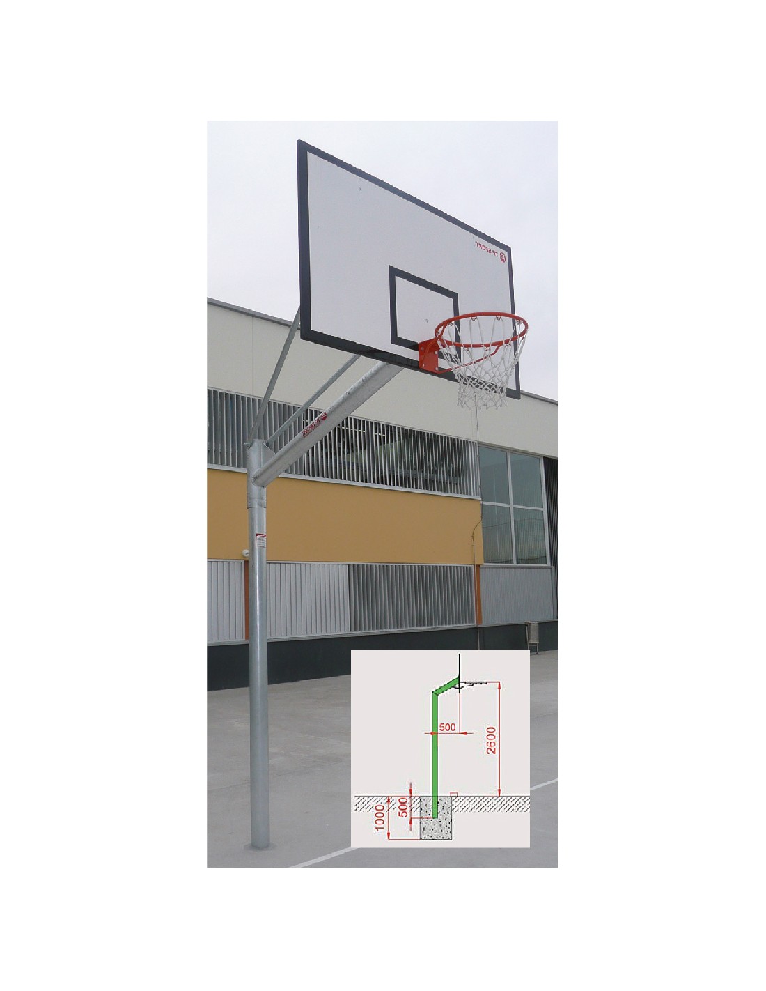 Para empotrar directamente en pavimento, mástil metálico en tubo redondo Ø 127x3, galvanizado para proteger contra el óxido y la corrosión. Salida de 1.65 m. Tablero Poliéster 1800x1050x20mm. Aro normal. Red Nylon.