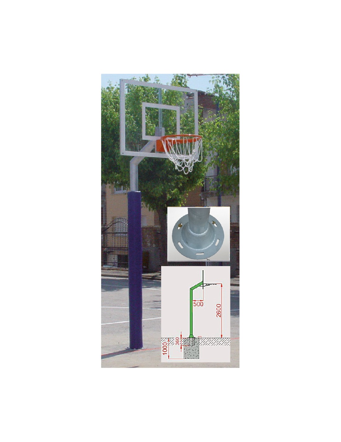 Desmontables mediante tornillos y doble placa de anclaje a nivel de pavimento, mástil en tubo Ø 127x3, tablero 1200x900. Galvanizado. Saliente 1050mm. Tablero poliéster. Aros y redes.