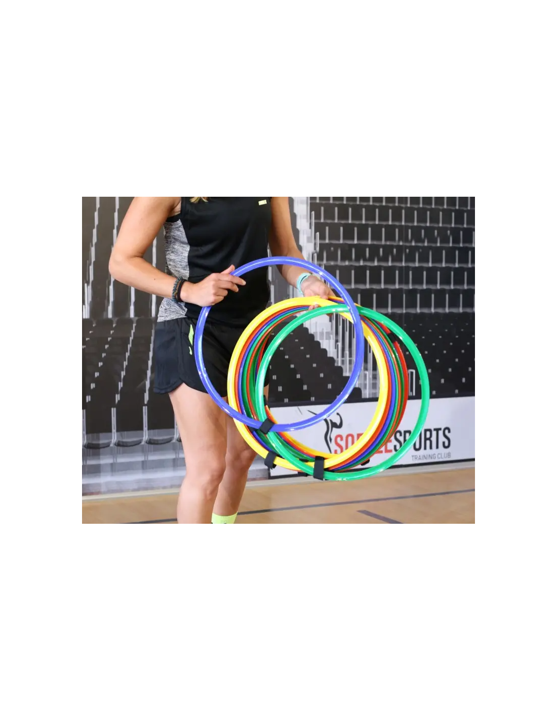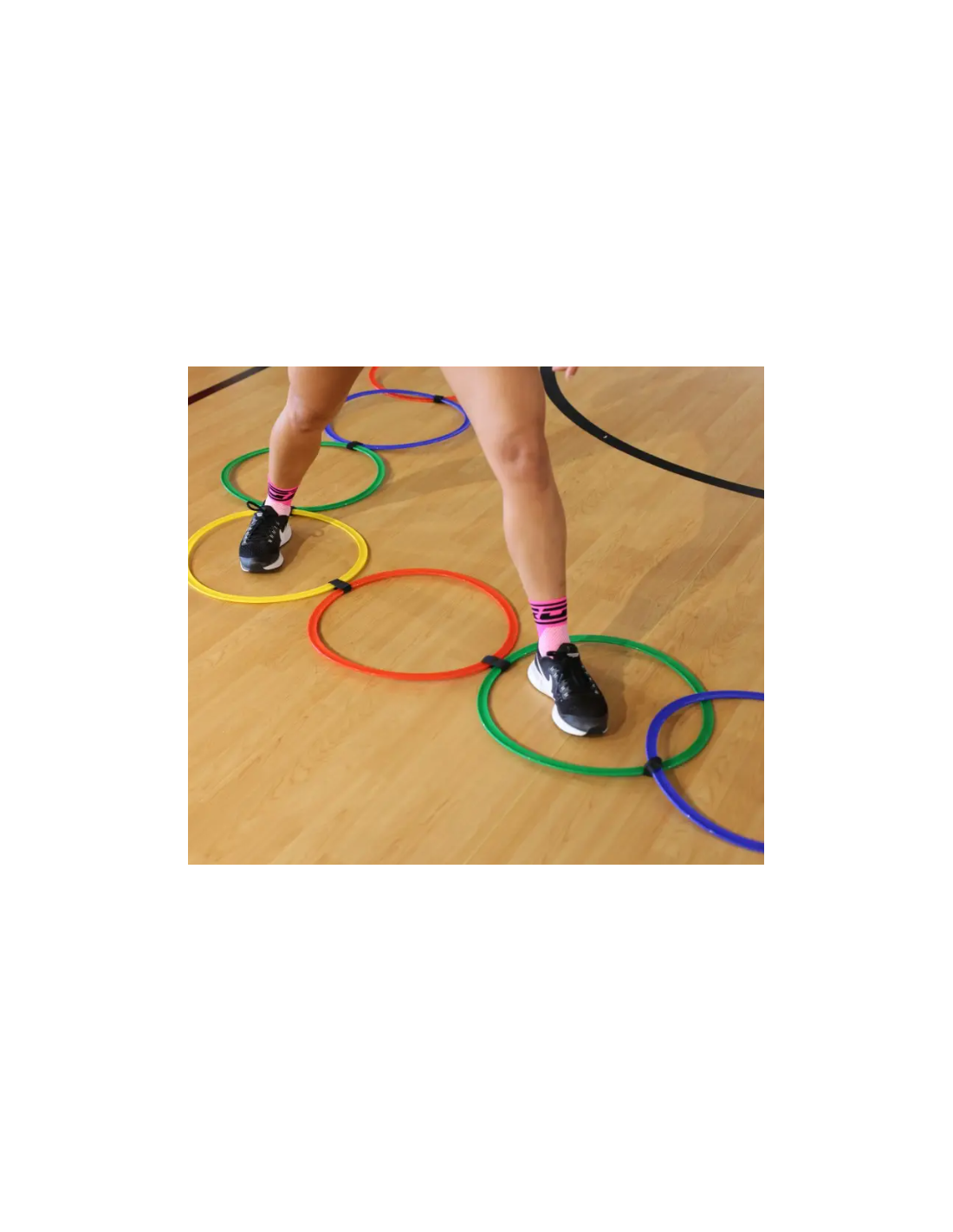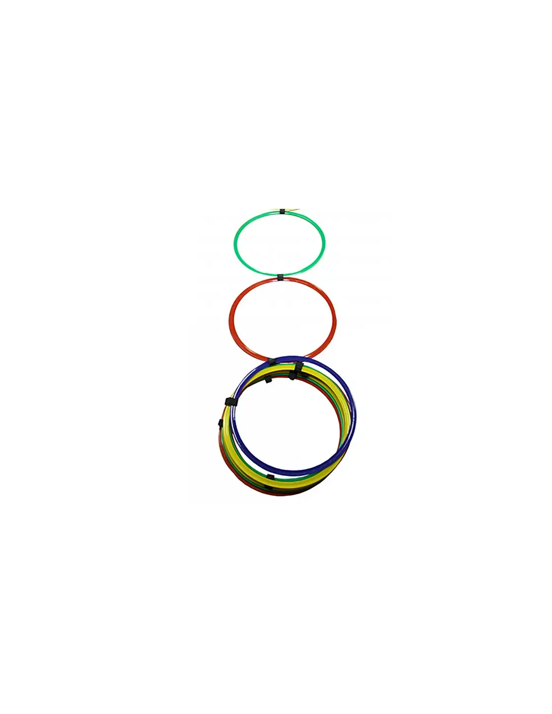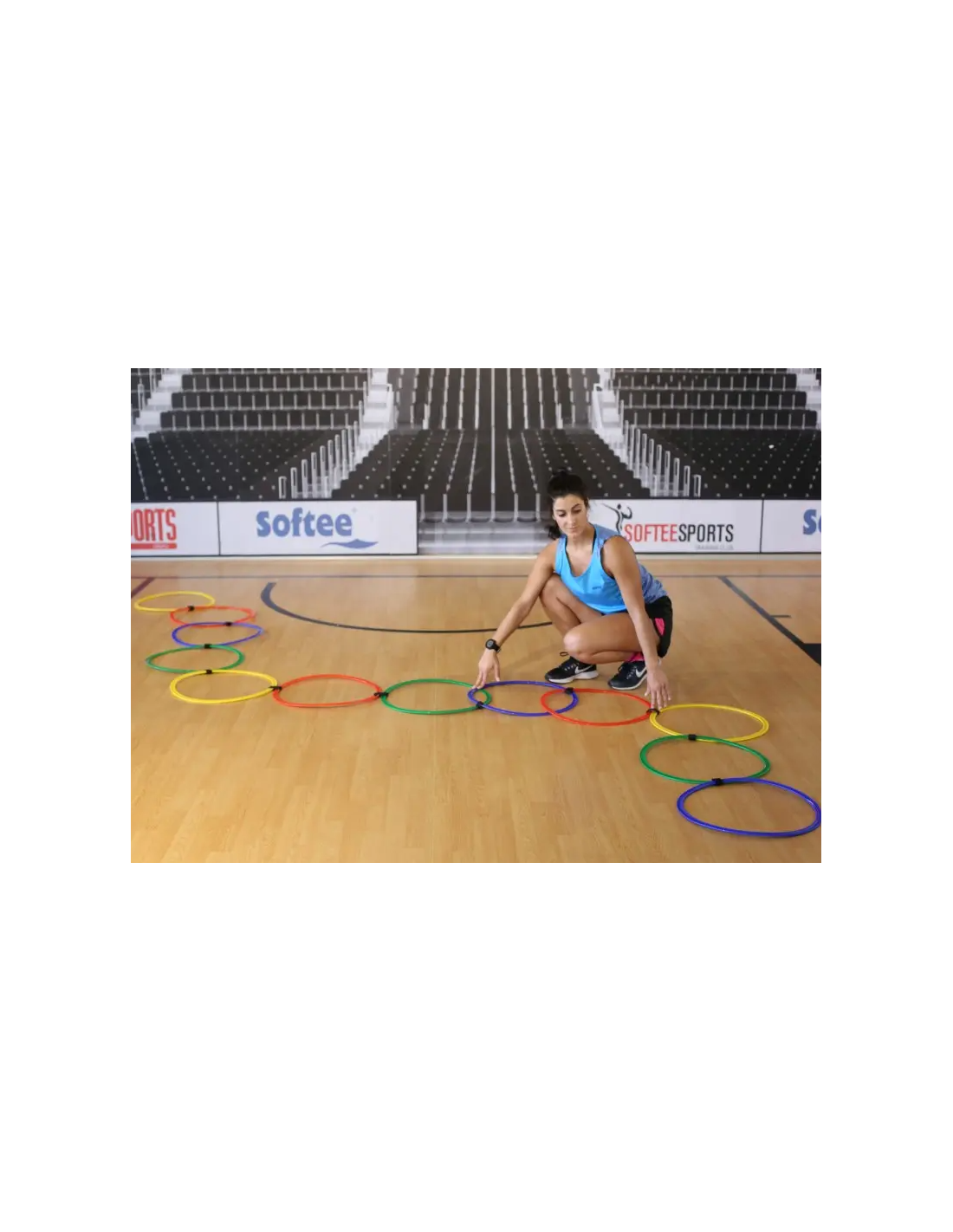 12 aros planos de diferentes colores y diámetros de 45 cm unidos mediante argollas de velcro permiten diferentes formas.