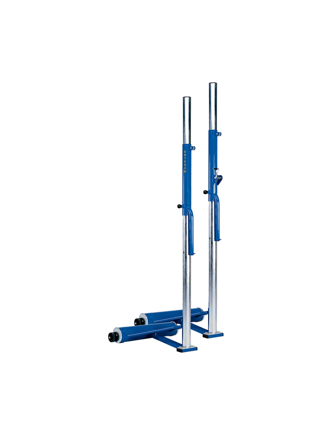 Postes de voleibol escolares con base contrapesada. Poste en perfil de acero de Ø80/90 mm (anclaje de Ø80 mm). Incorpora predefinidas las 8 alturas de voleibol, bádminton y tenis. Tensión de la red mediante un torno integrado en uno de los postes. El juego incluye dos postes complementarios. No incluye anclajes estabilizadores.