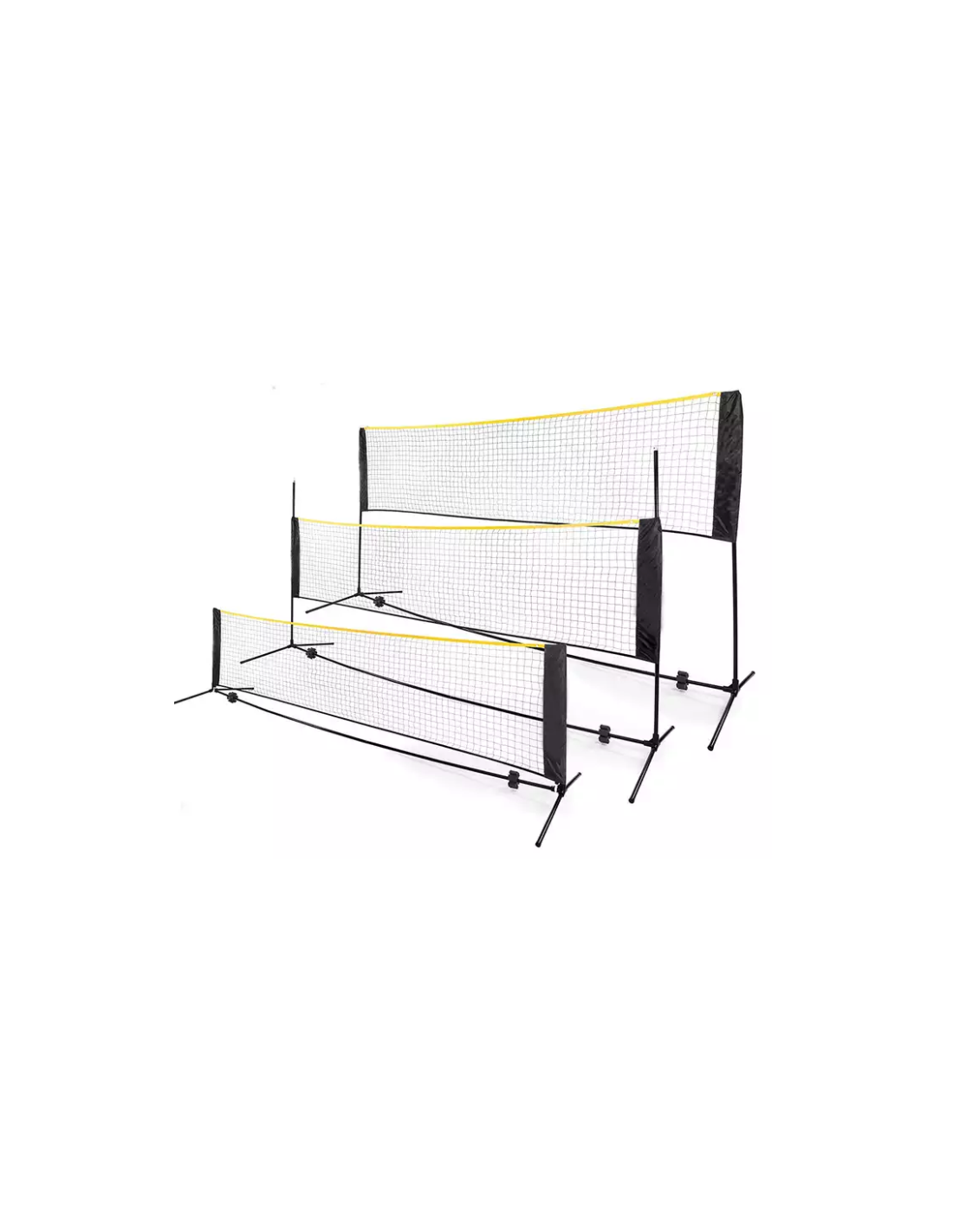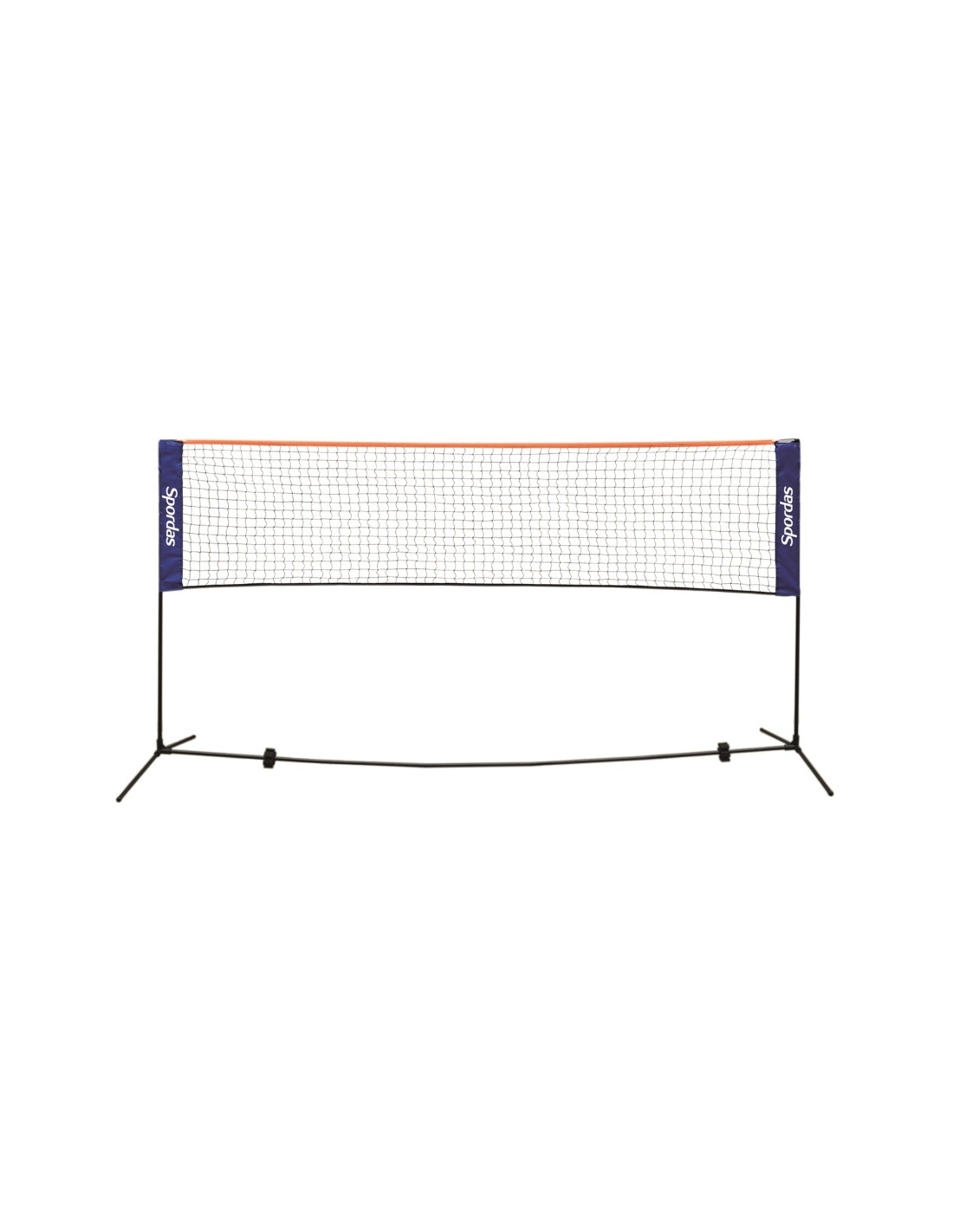 Una red de bádminton/mini tenis portátil y liviana que se puede colocar en cualquier terreno plano (césped, gimnasio, concreto, etc.). La red tiene 5 metros de ancho, que es el tamaño de una cancha normal de bádminton. Muy fácil de montar y desmontar. Postes de acero resistente (altura: 1,55 m, diámetro: 19 mm). Para usar para bádminton, simplemente levante los postes laterales del extremo. Para usarlo en mini-tenis, bájelo. Viene con una práctica bolsa de transporte (90 cm de largo).