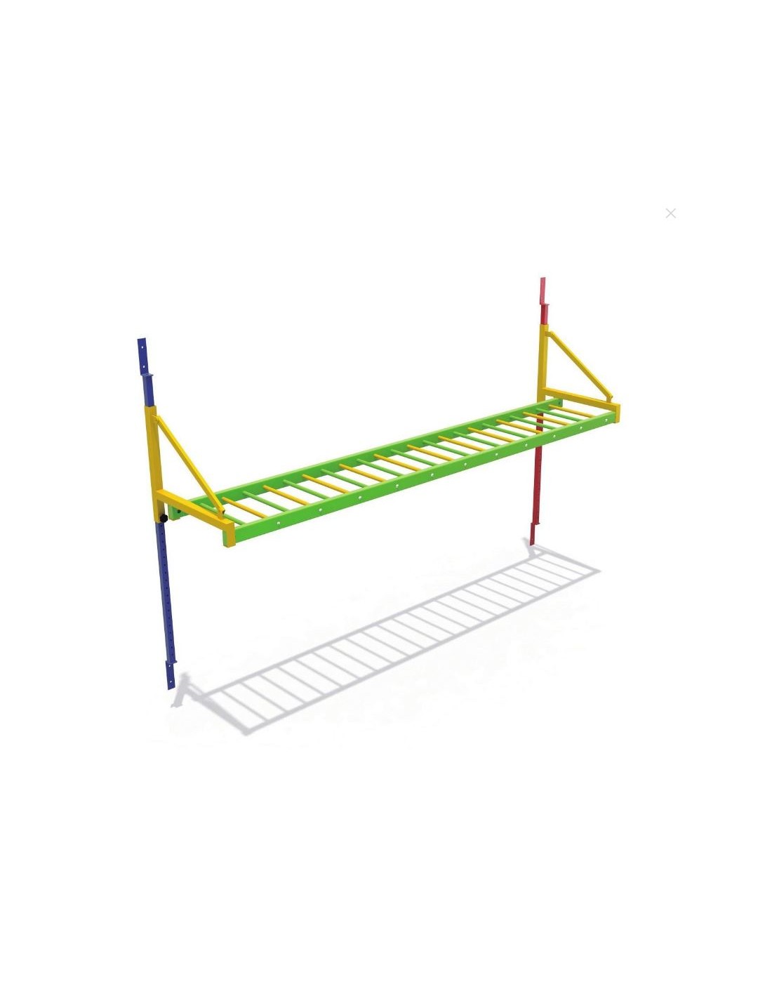 Escalera de braquiación metálica, fabricada en acero galvanizado y recubierto con pintura epoxi. Apto para exteriores, con regulación de altura manual, adaptando la medida a las necesidades de los niños. Barras fijas con separación cada 30 cm. Incluye 10 barras extraíbles para colocar en medio de las fijas, dando una separación de 15 cm si se desea. Máxima altura de la escalera 2 metros.