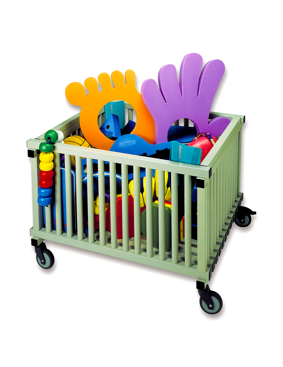 Carro con ruedas para piscinas, fabricado con tubos cuadrados de PVC que resisten a las humedades, los ácidos y las grasas. Tienen cuatro ruedas giratorias, dos de ellas con freno.