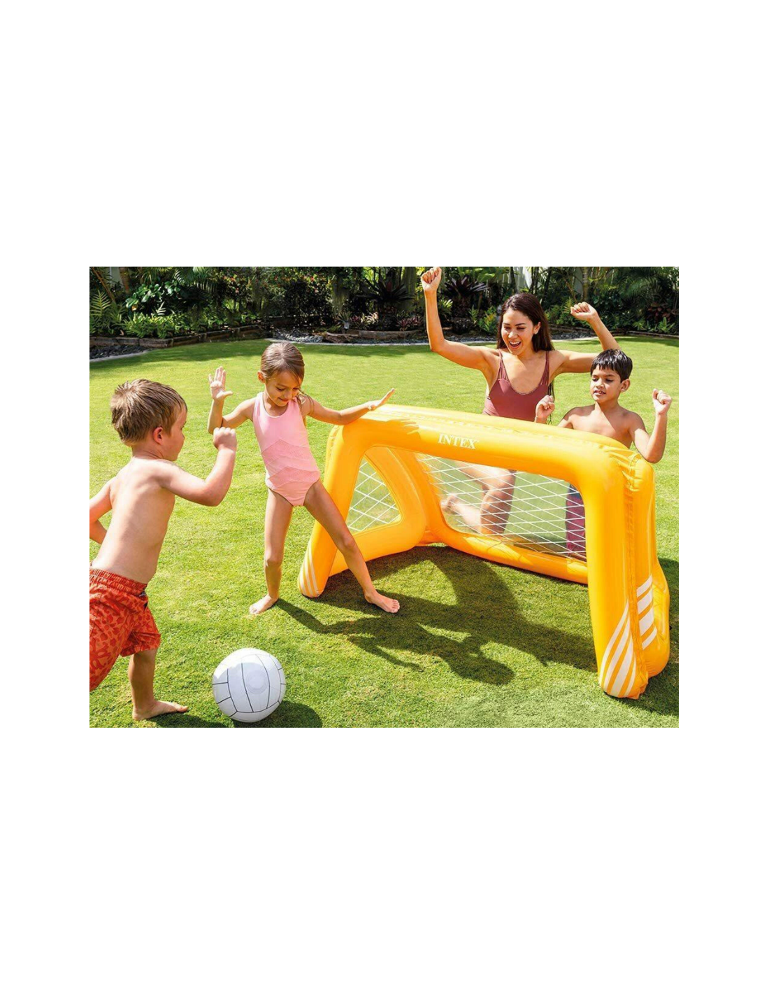Portería hinchable Intex para la piscina o para jardín. Mide 140x89x81 cm y en las paredes lleva una red. Incluye un balón blanco para ambos juegos y dos bolsas estabilizadoras.