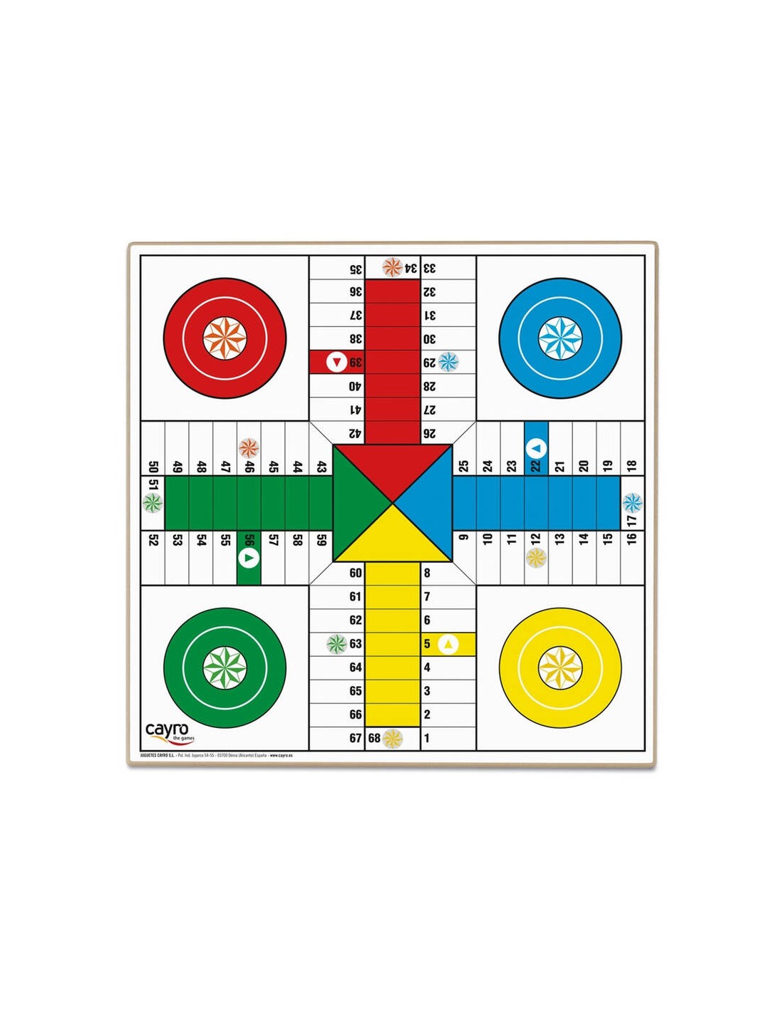 De doble cara, por una el juego del Parchís y la oca. Fabricado en madera. Medida: 33 x 33 cm.