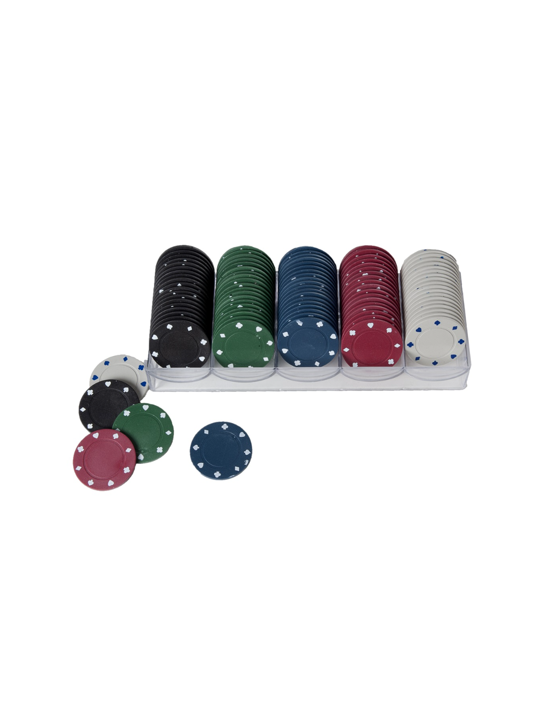 Caja de 100 fichas en cinco colores diferentes. Diámetro: 40mm. Peso: 4 gramos.