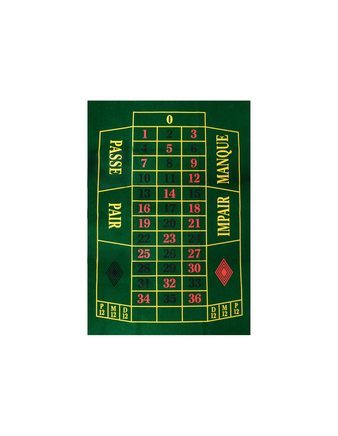 Alfombra ruleta realizada en fieltro verde. Dimensiones: 130 x 90 cm. Espesor paño: 3mm.