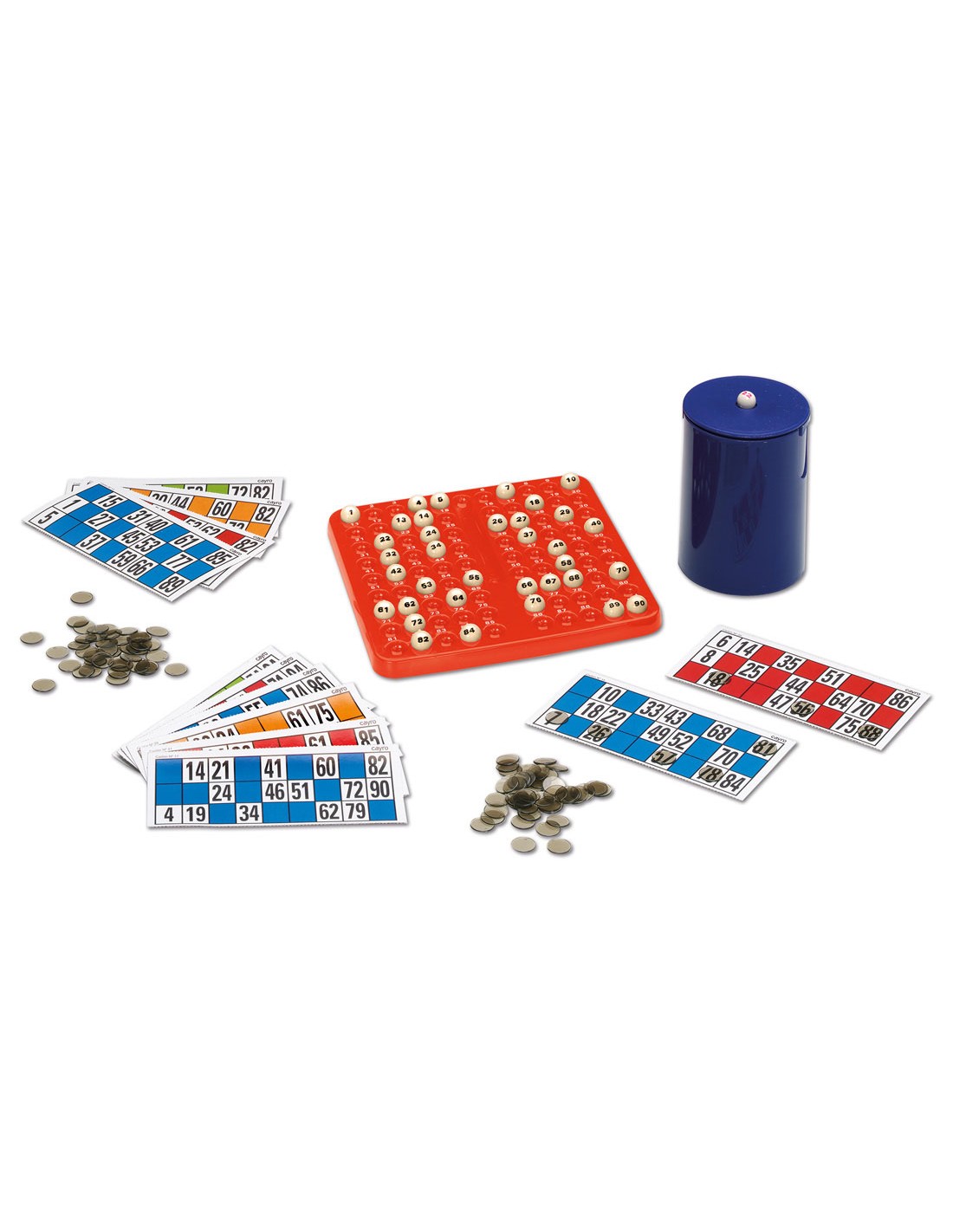 Cada vez que friccionas el bote de arriba abajo, sale una bola, colócala en la plantilla y ves cantando números a ver si tenemos suerte y nos toca alguna ¡LINEA Ó BINGO! Lleva 48 cartones diferentes y un montón de fichas para marcar los números que van saliendo