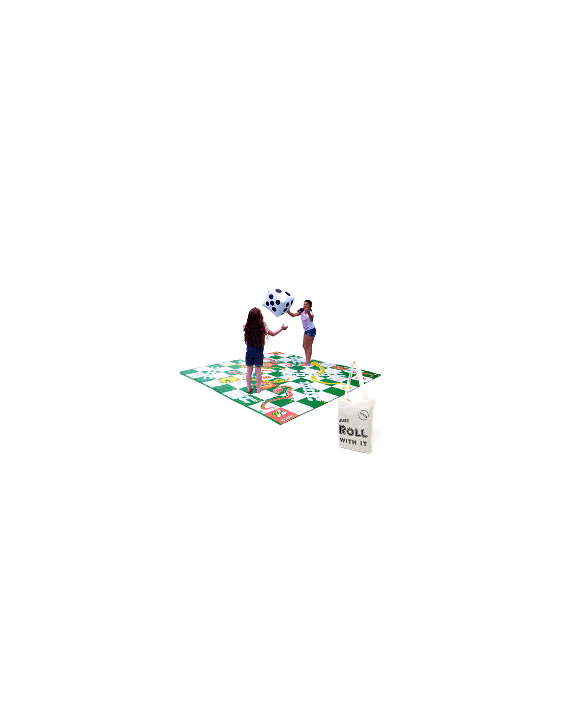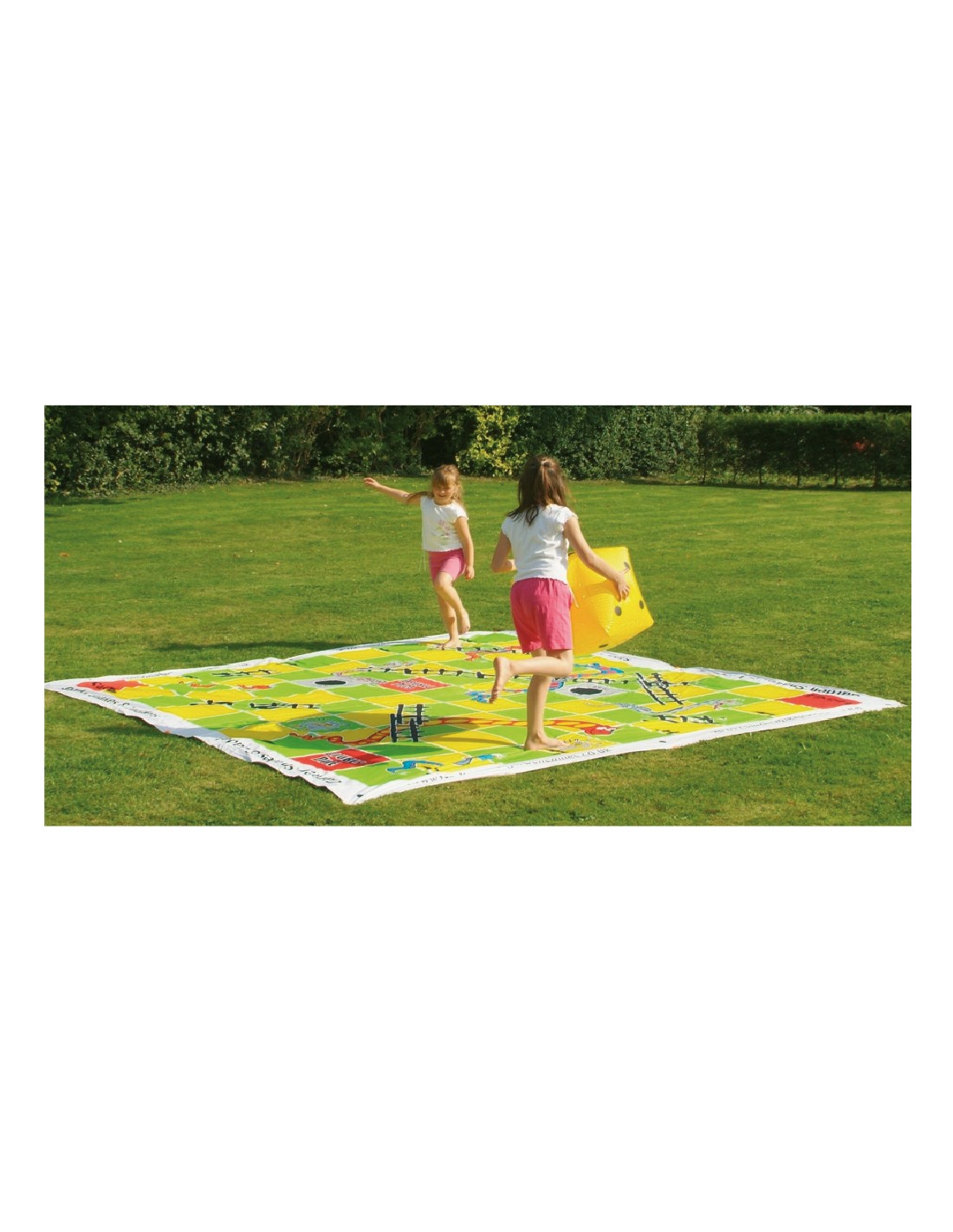 Los propios jugadores actúan como contadores en esta versión de jardín del juego clásico y suben las escaleras y bajan las serpientes en una alfombra de plástico de 3 metros cuadrados. Contiene: Tapete 3x3 m, dados inflables gigantes, bolsa de almacenamiento.