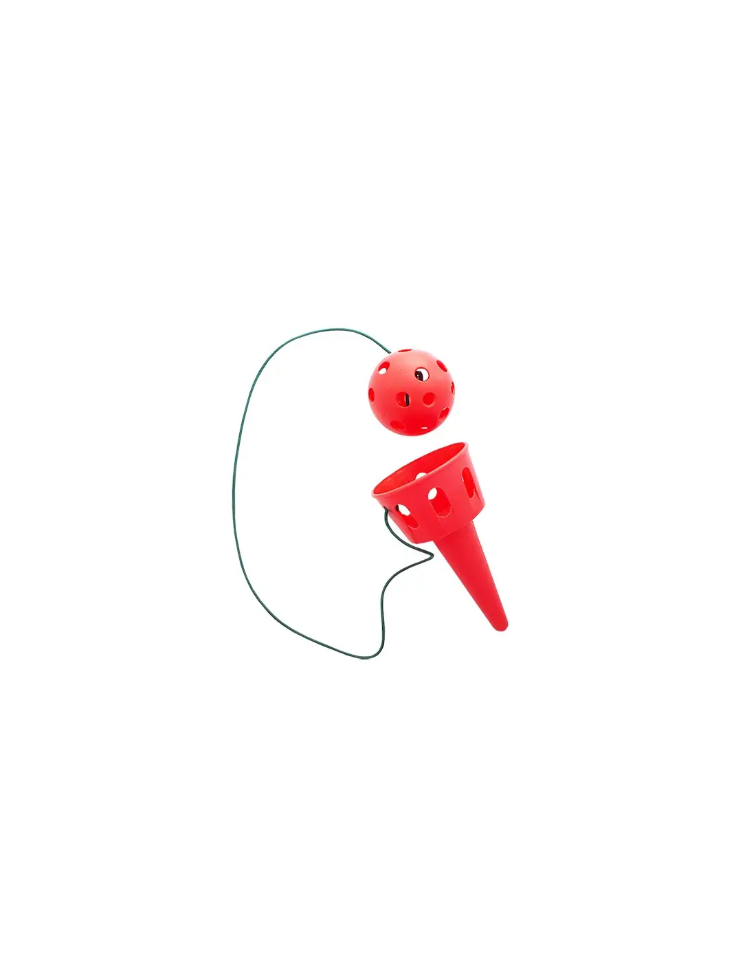 Juego popular provisto de cucurucho y pelota con agujeros unidos mediante cordón elástico de 70 cm.