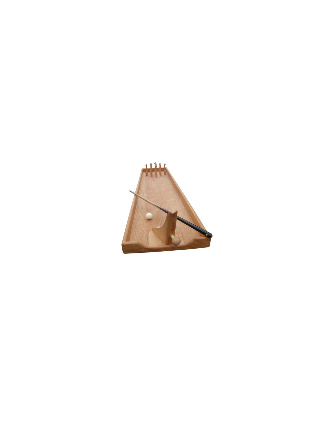 Incluye: 9 bolos, 1 rampa, 1 bola de billar y 1 taco.