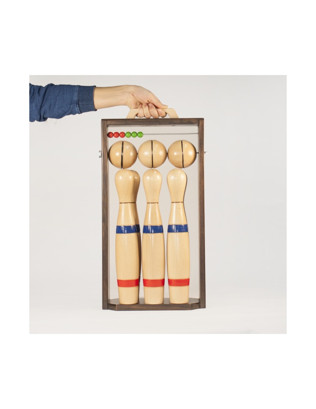 El juego se compone de 6 bolos de 35 cm de altura y tres bolas de 8 cm de diámetro. Todo fabricado en madera de haya. Pintado a mano y luego barnizado para protegerlo de la suciedad y asegurar una mayor durabilidad. Con el fin de transportarlo cómodamente se presenta en un marco de madera con una asa. 35 cm.
