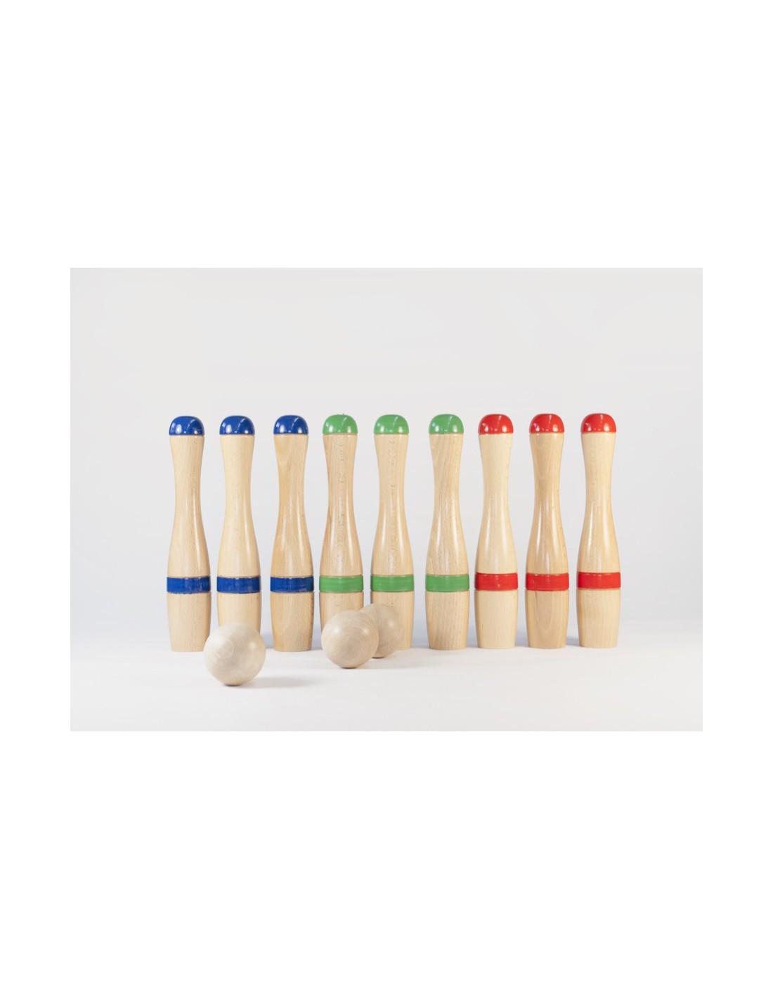 Miden 24 cms de altura y las tres bolas 5,7 cm de diametro. Tres bolos de tres colores distintos. Todo fabricado en madera de haya. El juego se presenta en red. 24 cm.
