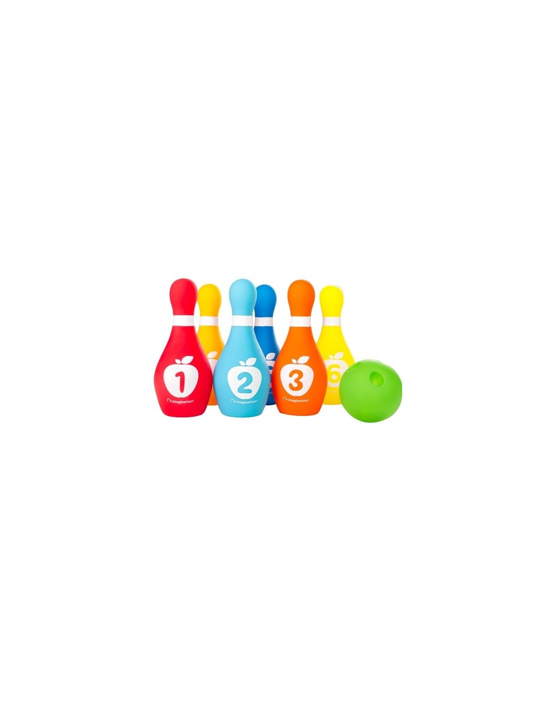 Juego de bolos formado por 6 bolos de colores numerados y una bola con 3 semi-orificios que imita a una de verdad. Fabricado PVC.