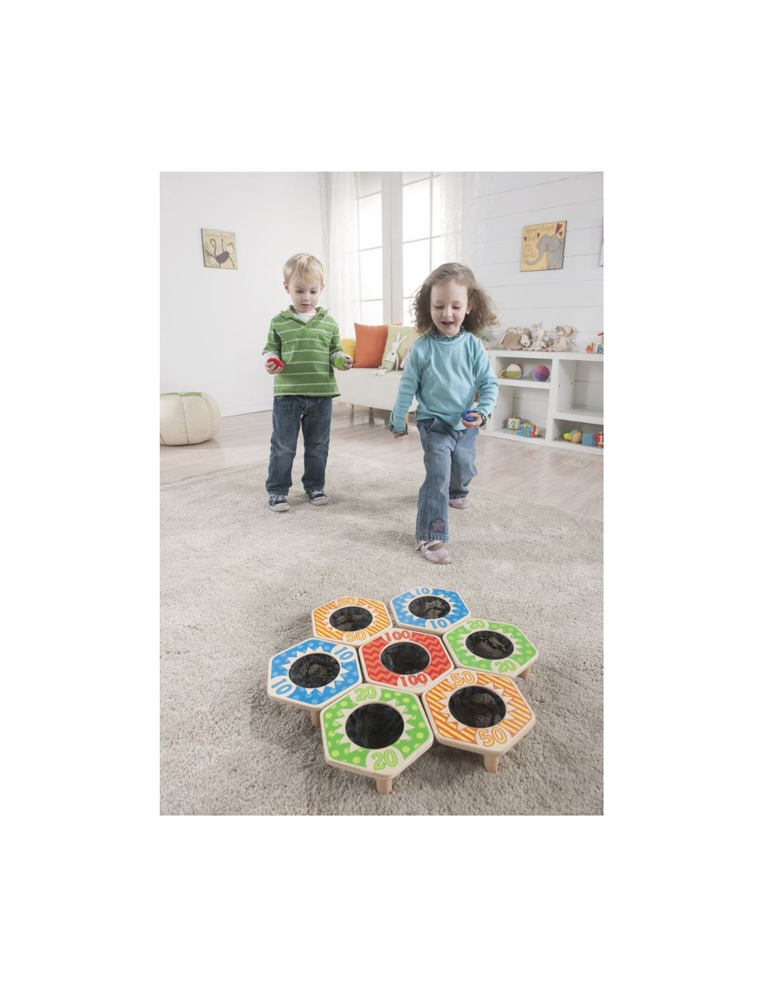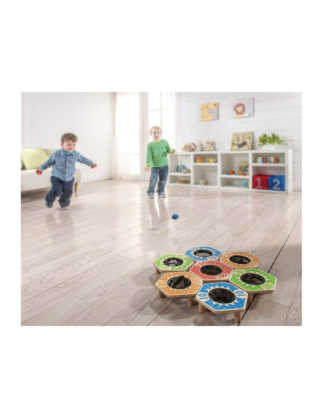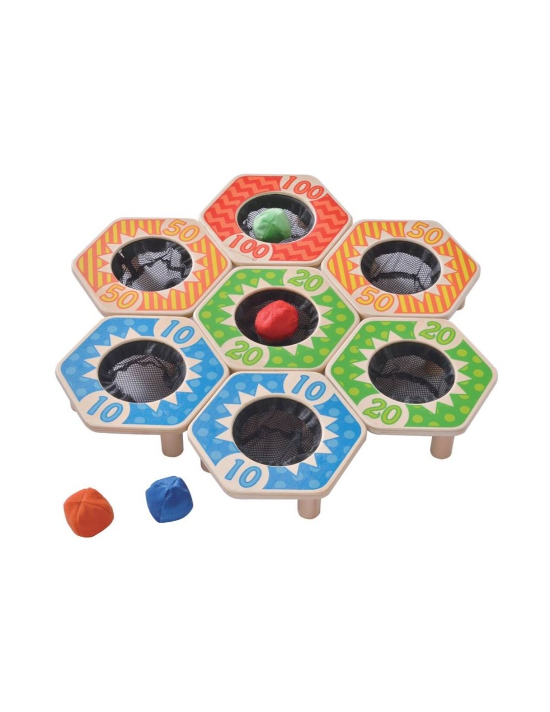 + 3 años. Juego de puntería que pone a prueba las destrezas y las habilidades para que a distancia las pelotas sean lanzadas y puedan ser acertadas a las canastas acumulando puntos. Juego idóneo para el desarrollo de las capacidades motoras y los aspectos competitivos del juego para toda la familia. Contiene 4 pelotas de tela rellenas de semilla, 7 canastas de madera con puntuación. (18 x 20 x 6,2 cm.)