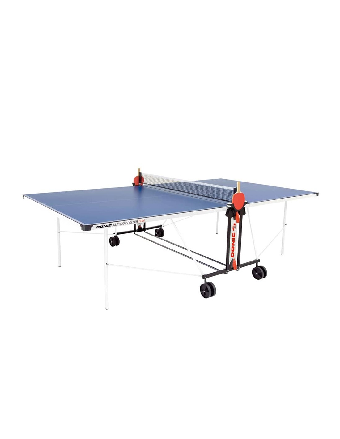 Superficie de resina de melamina de 4mm y marco de metal de 36mm. Con red. Ruedas dobles de 125mm. Sistema de seguridad de mango rotativo. Base en perfil de tubo redondo de 25 mm (recubierto de polvo), ruedas dobles de 125 mm, todas orientables. Red permanentemente adherida a la mesa.