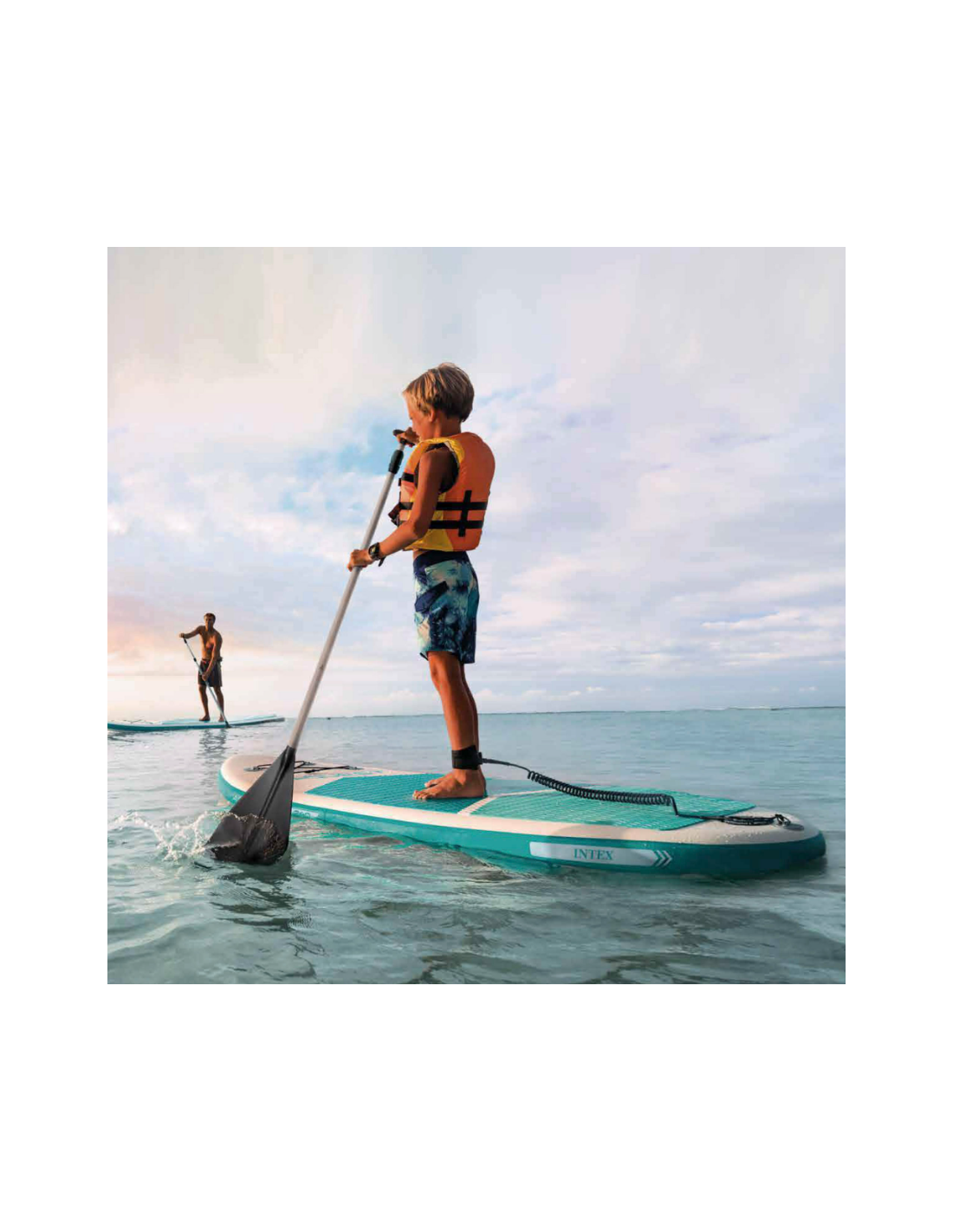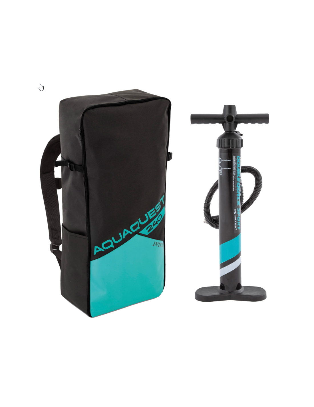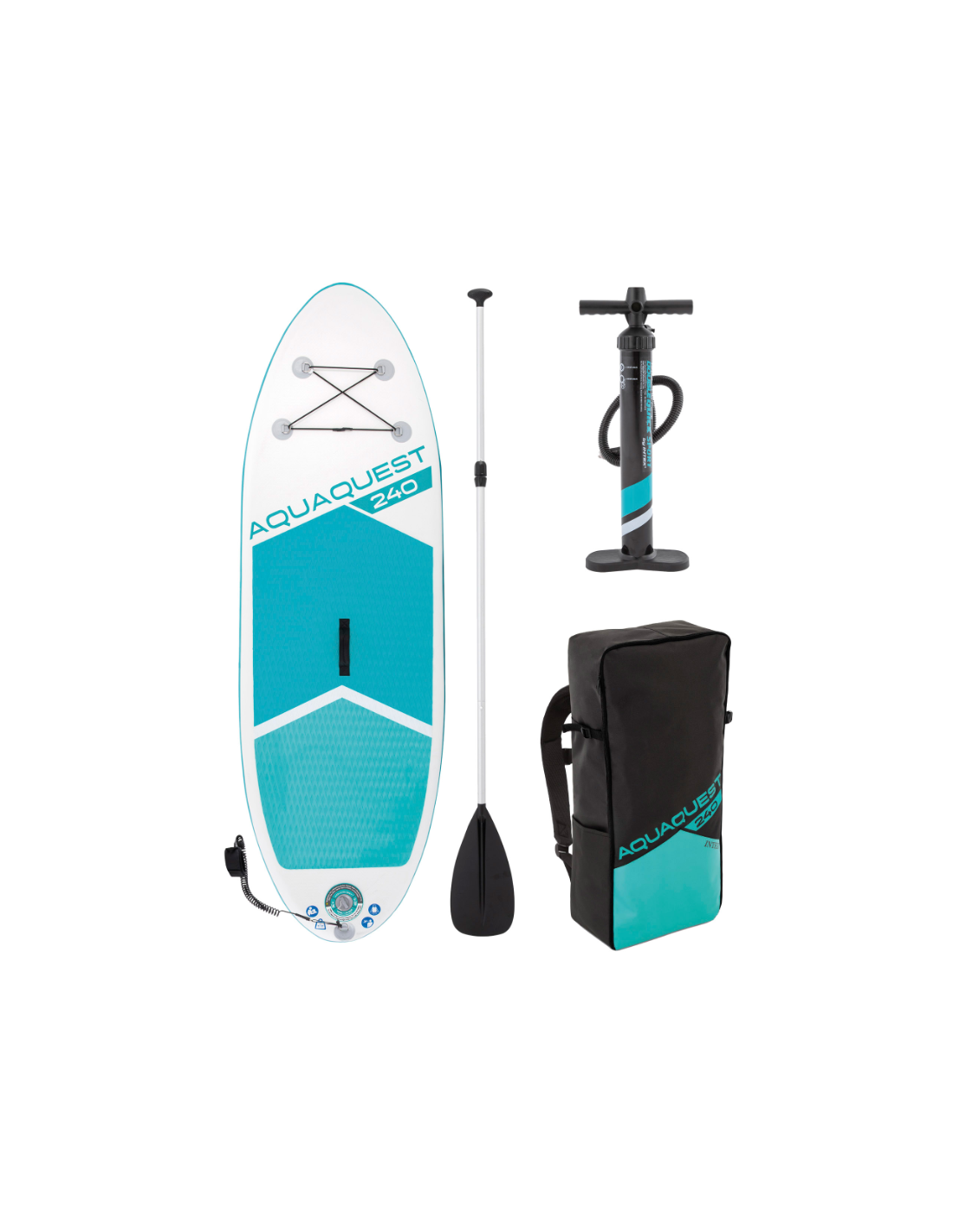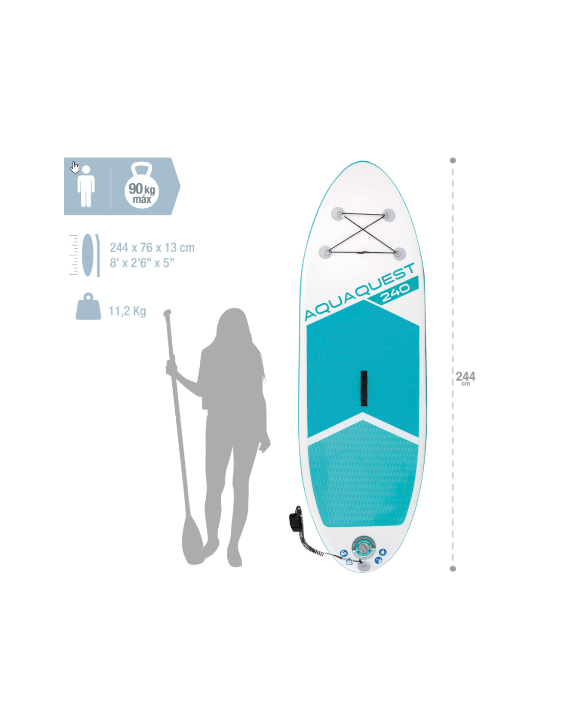 Incluye: 3 quillas extraíbles, una correa para enrollar al tobillo, mochila, una bomba de hinchado con manómetro, remo con mango de aluminio de 1.65 - 2.16 m.