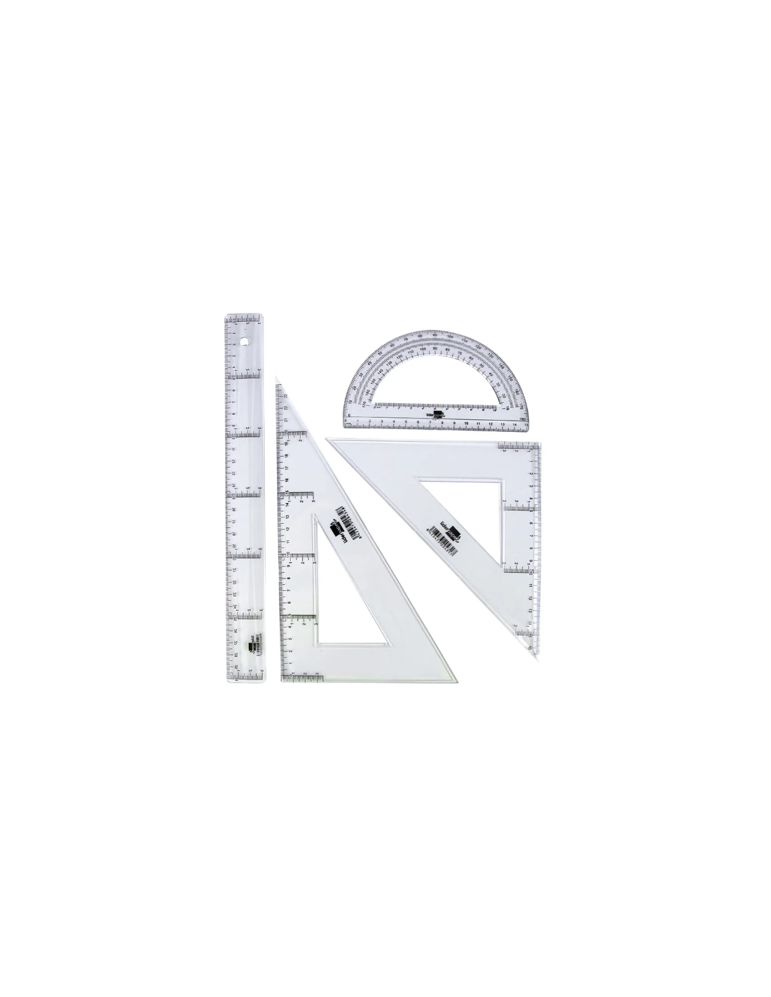 Juego en poliestireno inyectado, cristal transparente, compuesto por: Regla de 30 cm, escuadra de 30 cm, cartabón de 30 cm y semicírculo de 180° de 13 cm. Impresión serigráfica color negro.