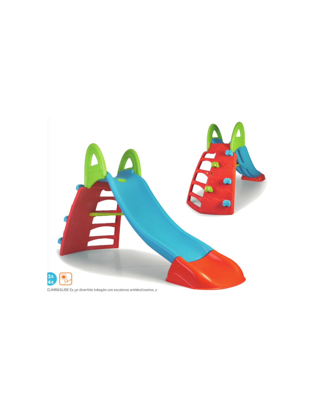 Divertido tobogán con escalera antideslizante y un muro especial. Perfecto para desarrollar la motricidad, así como el equilibrio y la fuerza. Medida de la rampa: 190 CM.