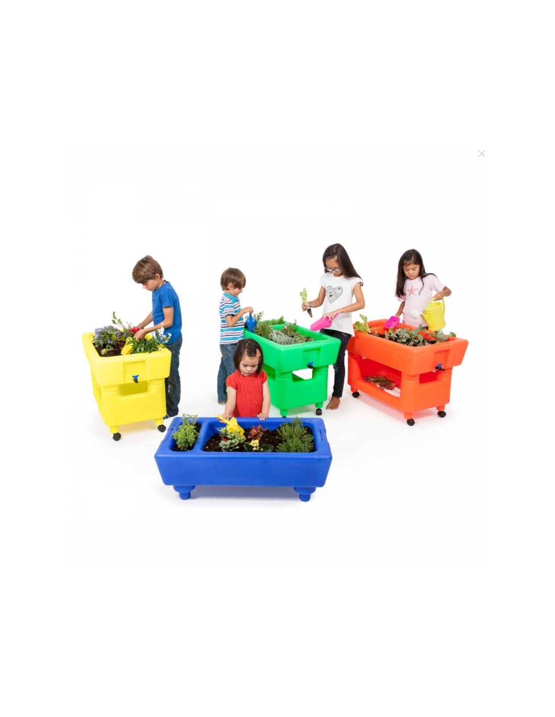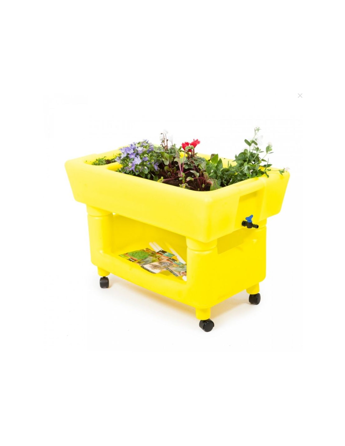 Incluye un contenedor superior, un soporte inferior, 6 sobres con semillas ecológicas, 1 saco de tierra, 1 pala, 1 rastrillo, 1 regadera y 6 tutores o guías para sujetar las plantas. Medidas: 900 x 500 x 625 mm.