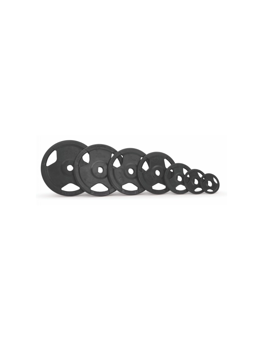 Plato olímpico de acero recubierto de caucho. Con 3 asas ergonómicas para adaptarse cómodamente a la mano a la hora del cambio de platos.