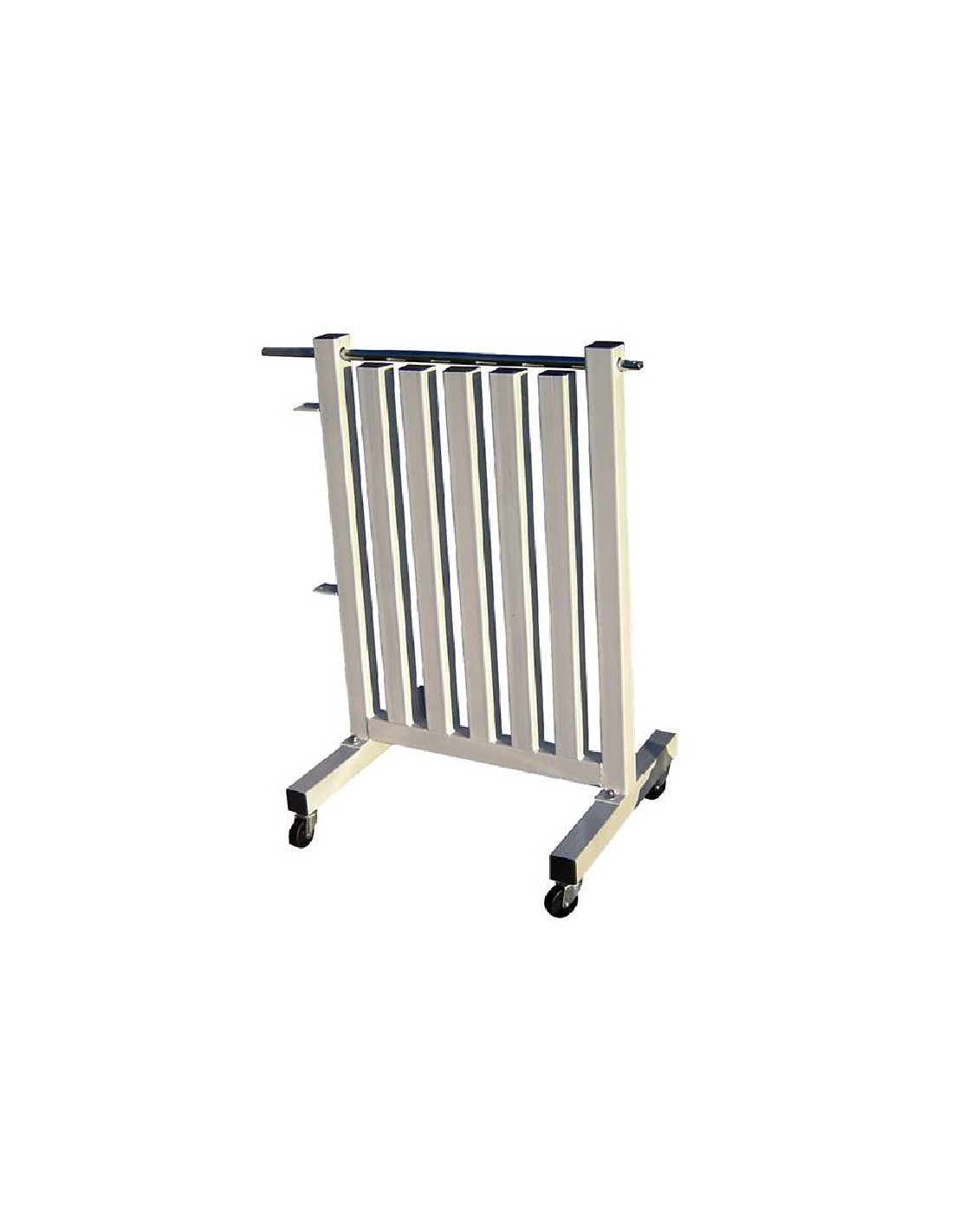 Soporte metálico reforzado. Dispone de 6 canales para almacenar pesas de vinilo. Ruedas para su traslado y barra superior para cierre. Medidas: 1.15x1.70x0.12 m.