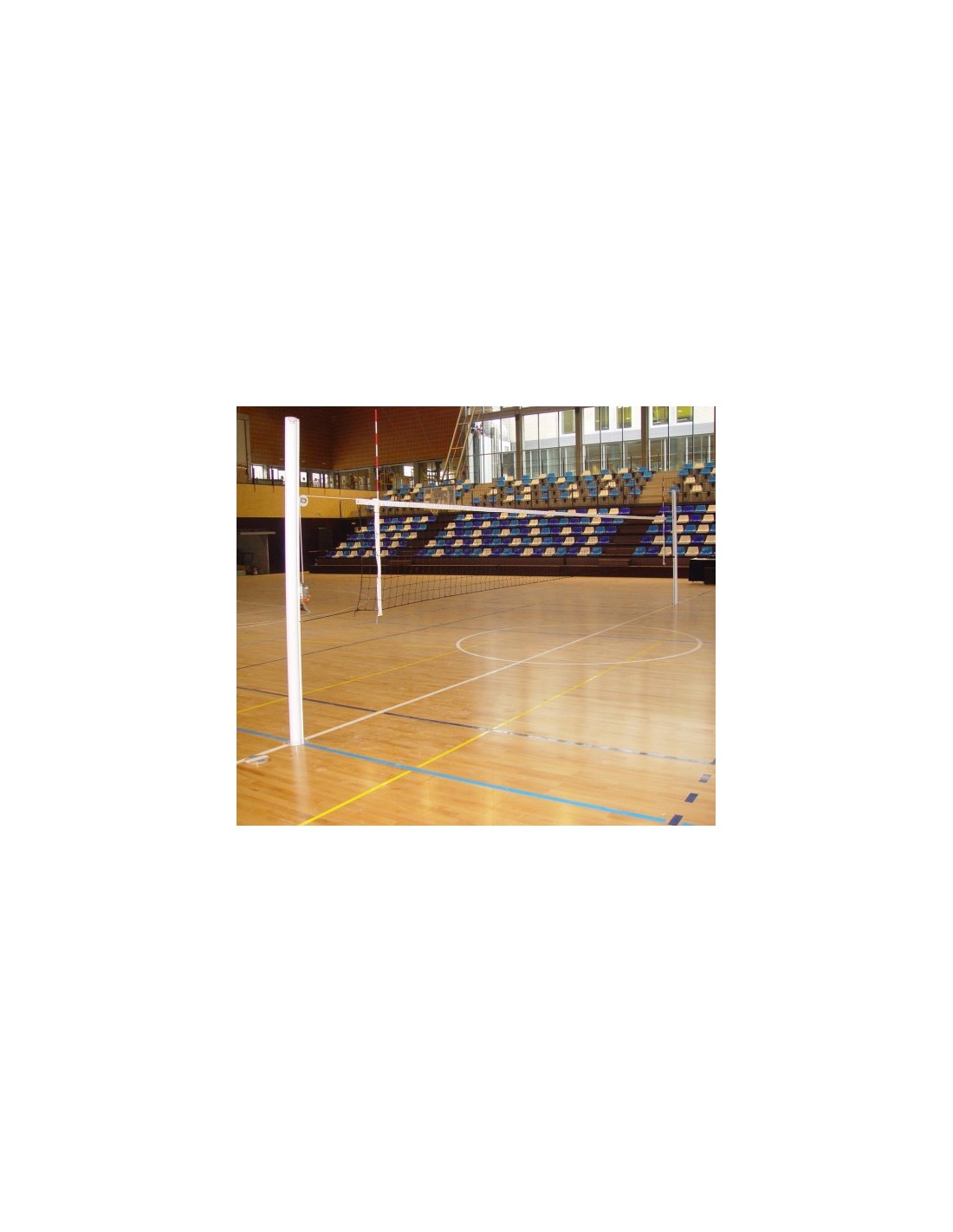 Juego de postes fijos de aluminio de voleibol fabricados según normativa UNE EN 12710:2004 con un anclaje metálico para su fijación al pavimento.