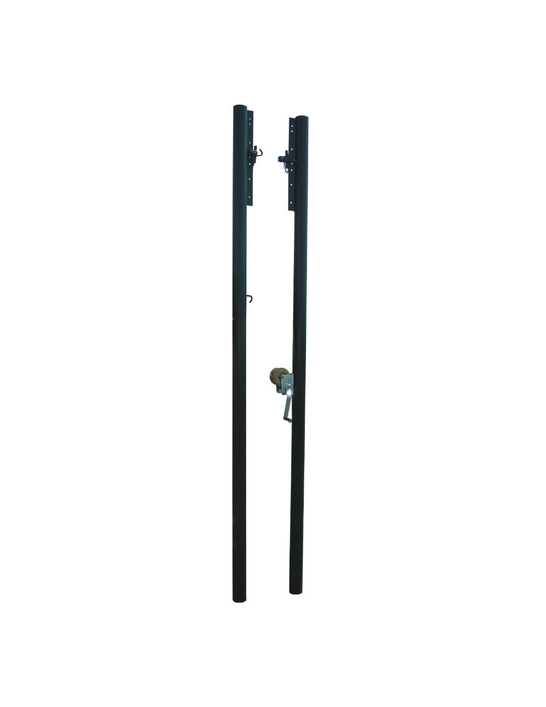Postes fabricados en acero de sección redonda 80 mm, diseñados para anclar en el suelo mediante botes metálicos (no incluidos) empotrados en zapatas de hormigón. Incluye carraca tensora para poder tensar el cable de la red que se quiera colocar y sistema regulador de altura de red.