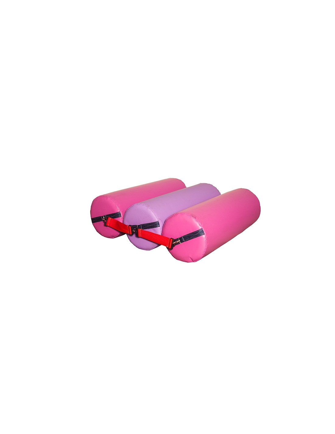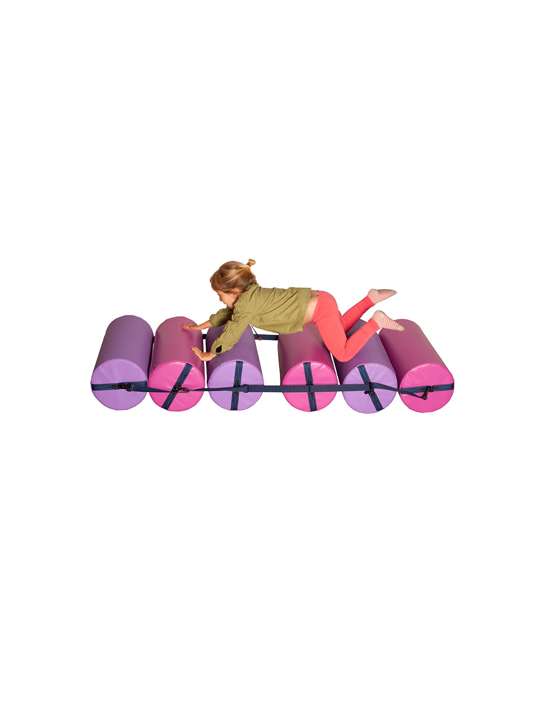 Rodillos de Psicomotricidad enganchados entre sí con cintas, que permiten al niño deslizarse sobre ellos. Están realizados en Espuma de Poluretano de 25 kg. recubierta de PVC poliéster de colores.