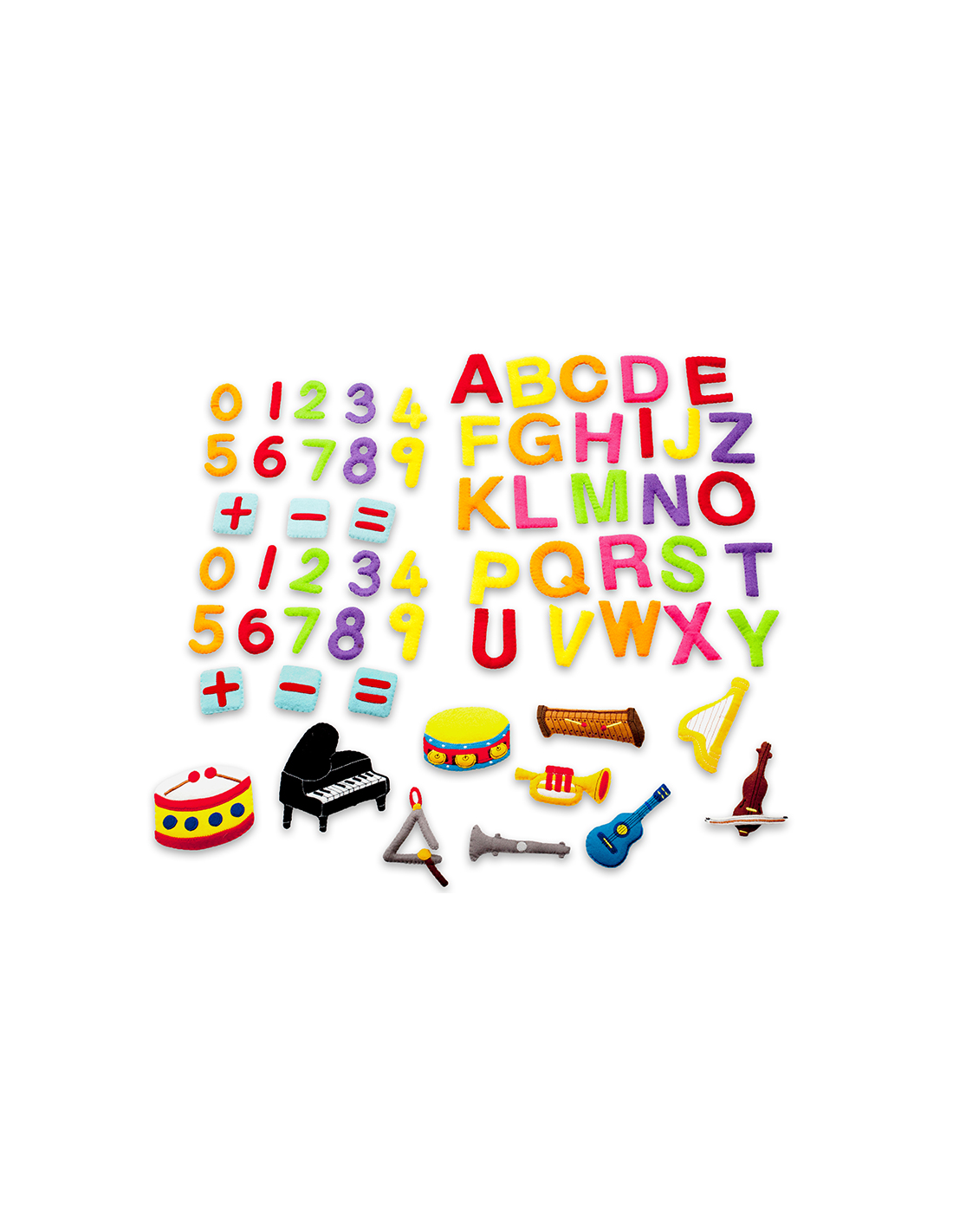 PACK VELCROS 62 PIEZAS LETRAS, NÚMEROS, MÚSICA