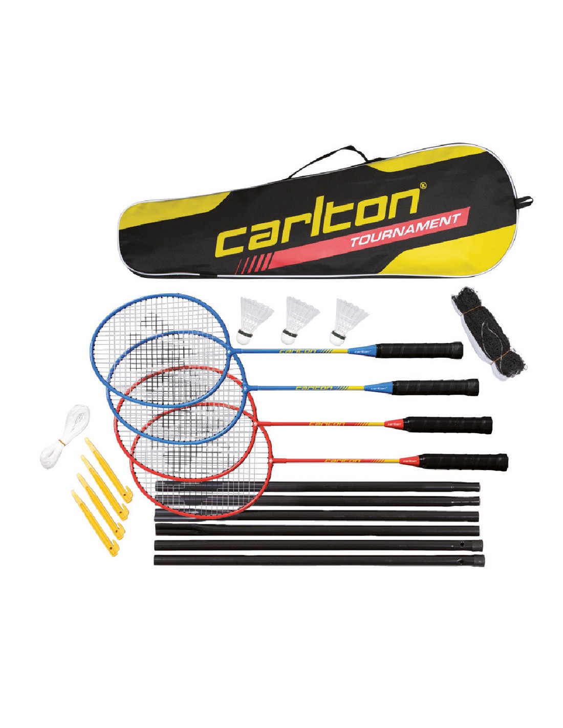 Juego de 4 raquetas de acero + 3 volantes sintéticos + 1 red y postes. Bolsa transporte.
