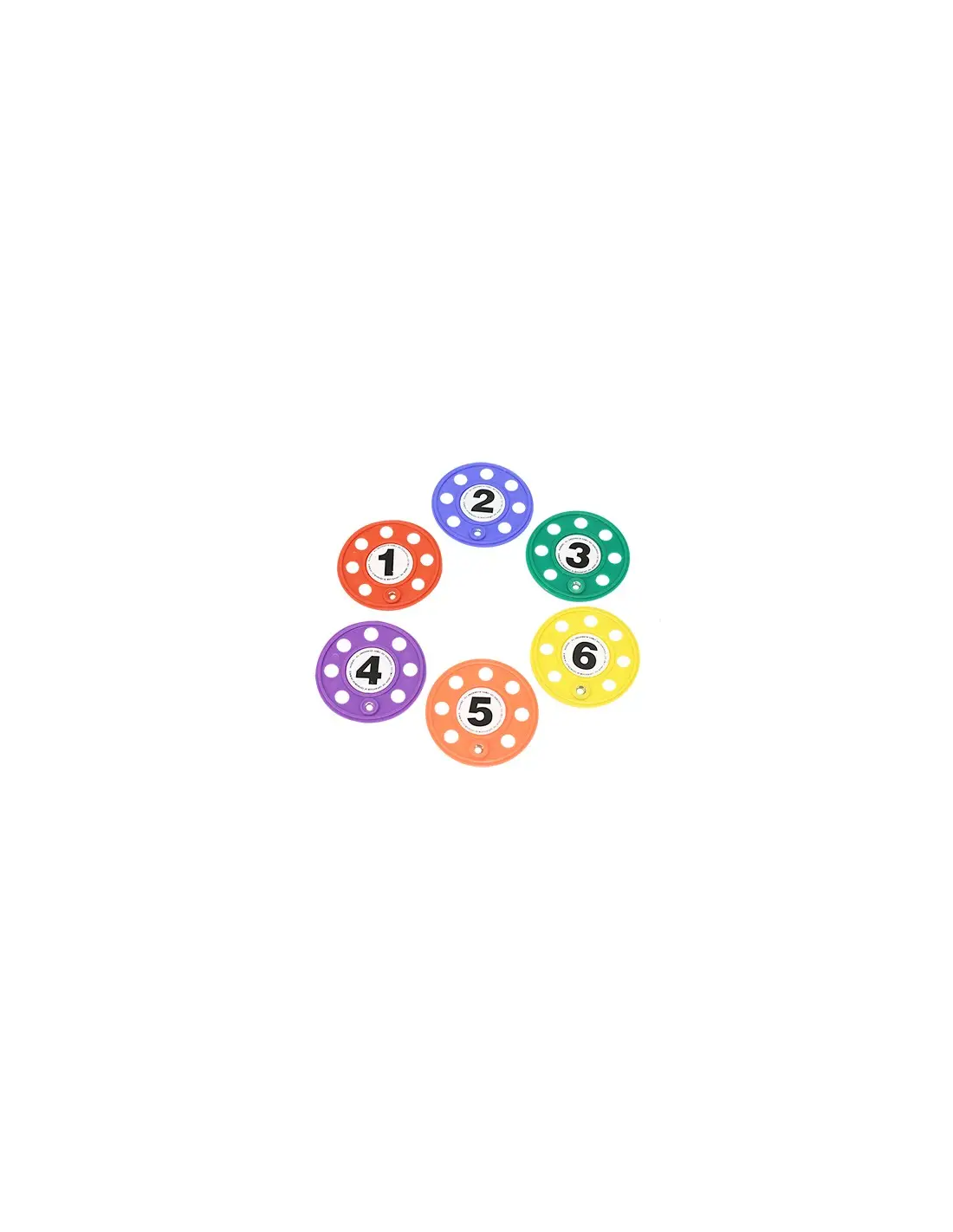 Juego didáctico compuesto de 6 unnidades de discos con agujeros, numerados y de difentes colores. Al echarlos al agua revolotearán hasta llegar al suelo. Diámetro de cada disco: 9,5cm.