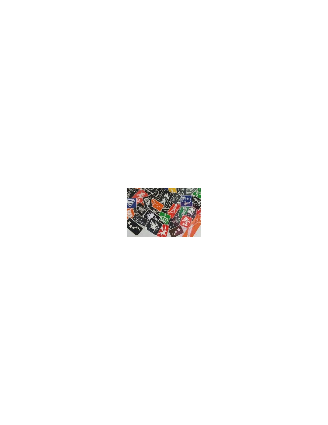 50 plantillas variadas de fabricación propia: delfines, mariposas, hadas, dragones, calaveras, personajes de los dibujos etc... Lo más popular.