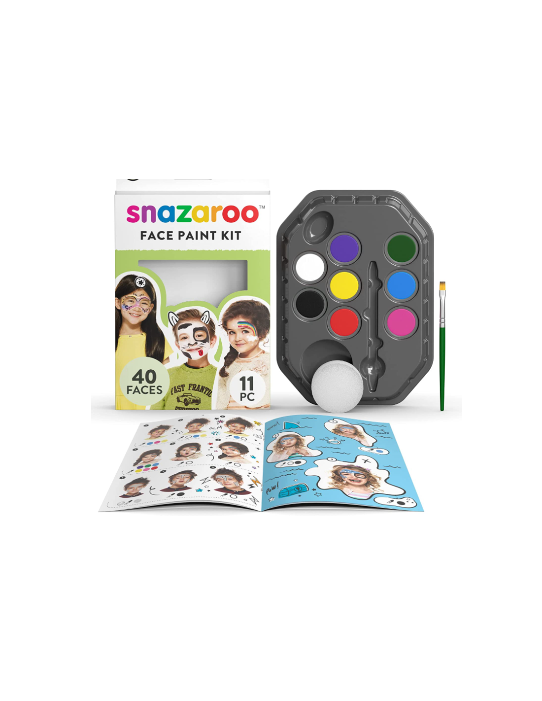 Contiene 2 ml de Blanco, Negro, Rojo brilliante, Púrpura, Rosa Brilliante, Amarillo Brilliante, Verde Hierba y Azul Cielo, junto con un pincel, una esponja y una guía paso a paso a todo color de pintura facial de 28 páginas.